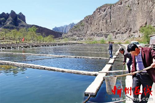 素有“江南水鄉(xiāng)”美稱的五臺(tái)縣陳家莊鄉(xiāng),是一個(gè)海拔只有640 米的秀美山鄉(xiāng),在五臺(tái)農(nóng)村商業(yè)銀行“金融扶貧”、“水產(chǎn)信貸”等專項(xiàng)貸款的大力扶持下,鄉(xiāng)黨委、鄉(xiāng)政府圍繞得天獨(dú)厚的泉水資源, 號(hào)召農(nóng)民發(fā)展水產(chǎn)養(yǎng)殖業(yè)。村民們先后建成5 個(gè)露天養(yǎng)魚(yú)場(chǎng),投放名貴紅鱒魚(yú)苗150 萬(wàn)尾,今年產(chǎn)量可望達(dá)到1.3 萬(wàn)公斤,以每公斤68元的價(jià)格遠(yuǎn)銷北京、西安,近銷太原、忻州、五臺(tái)山,年收入可達(dá)88 萬(wàn)元。圖為村民們?cè)谏饺B(yǎng)魚(yú)池?fù)启~(yú)。(金俊賢 鄭光 攝影報(bào)道)