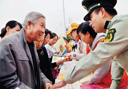 近日,忻州市消防支隊官兵和消防志愿者一同走上街頭,為申辦全省旅游發(fā)展大會助力,志愿者們手持宣傳單向過往群眾宣傳消防安全知識,鼓勵大家積極支持全省旅游發(fā)展大會相關(guān)活動。過往群眾不時駐足觀看,現(xiàn)場拿出手機掃描二維碼參與投票。(張志遠(yuǎn) 白耀周 攝)