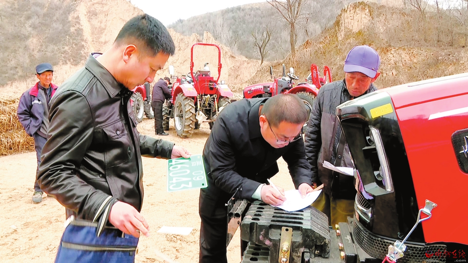 近日,河曲縣行政審批局開展了“田間地頭辦實事”活動,為當?shù)剞r(nóng)民新購置的輪式拖拉機現(xiàn)場辦理登記查驗手續(xù),用實際行動助力春耕生產(chǎn)。(張靚 周三光 攝)