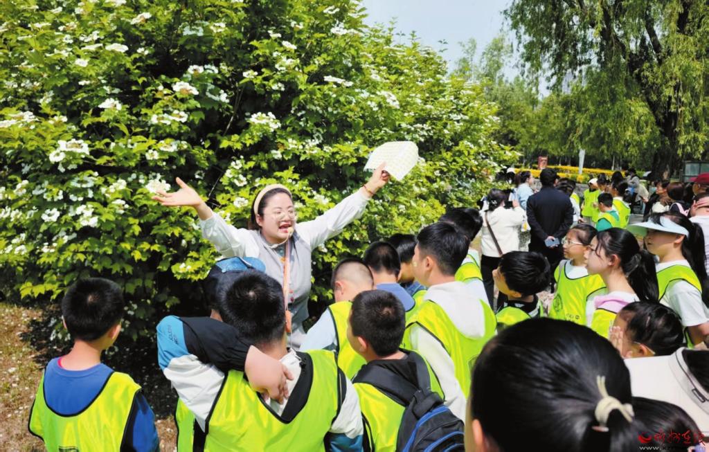 初夏時(shí)節(jié),忻府區(qū)花開(kāi)正艷、氣候宜人,孩子們走出校園,開(kāi)啟了一場(chǎng)別開(kāi)生面的研學(xué)之旅,在大自然中增長(zhǎng)知識(shí)、收獲成長(zhǎng)。活動(dòng)中,孩子們?cè)诶蠋煹膸ьI(lǐng)下,了解本地植物種類(lèi)和生態(tài)鏈相關(guān)知識(shí),認(rèn)真填寫(xiě)研學(xué)手冊(cè)。圖為5月10日,參加研學(xué)活動(dòng)的學(xué)生在人民公園聽(tīng)老師講解植物特性。 (記者 張存良攝)