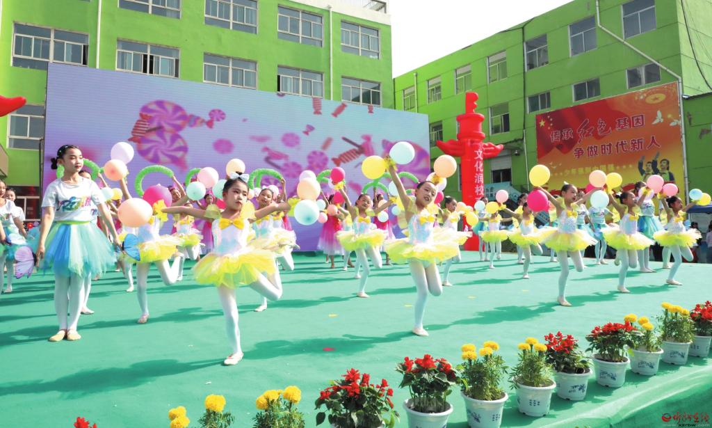 5月13日,原平市第一小學(xué)舉辦第五屆以“科技筑夢(mèng)譜新篇體藝賦能向未來(lái)”為主題的為期15天的校園科技文化藝術(shù)節(jié)。圖為開(kāi)幕式當(dāng)日,學(xué)生自編自演的舞蹈節(jié)目。(褚震 攝)