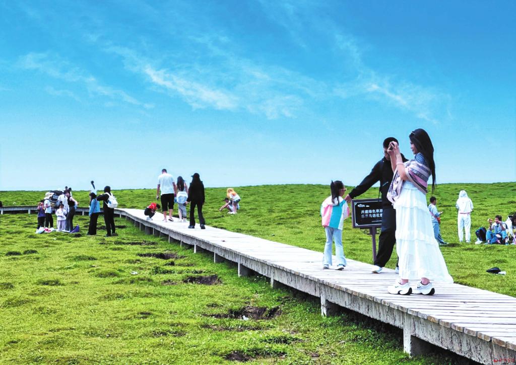 入伏以來(lái),寧武蘆芽山旅游度假區(qū)的馬侖草原迎來(lái)眾多游客。藍(lán)天白云下,木質(zhì)棧道蜿蜒穿過(guò)翠綠草場(chǎng),游客或漫步賞景、或拍照留念,沉浸在夏日草原的自然美景中。(吳光宇 劉強(qiáng)攝)