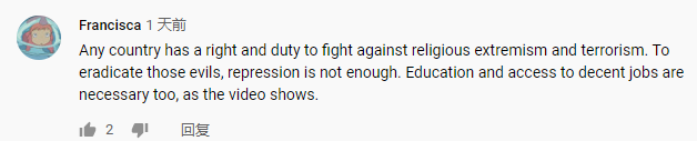 “任何國家都有權(quán)利和義務(wù)打擊宗教極端主義和恐怖主義。要根除這些邪惡……教育和獲得體面工作的機會也是必要的?!苯?,一名海外網(wǎng)友Francisca在看完中央廣播電視總臺旗下CGTN播出的《巍巍天山——中國新疆反恐記憶》紀錄片后這樣評價。
