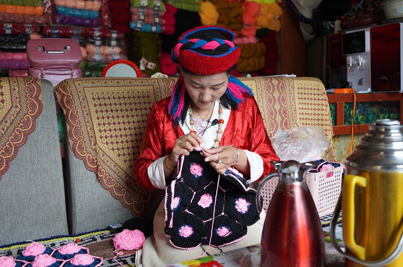 卓瑪正在家里用毛線編織著一對玫瑰花花色的抱枕套,這一對能賣400元。 2015年,當地政府扶持每家每戶購買了農家樂設施設備,包括床、電視以及電視柜等?!拔疫@邊有8間房,可以住16個人?!弊楷?015年開始經營農家樂,一樓擺放著一些當地特產,偶爾還會給客人提供甜茶、蓋澆飯等。
