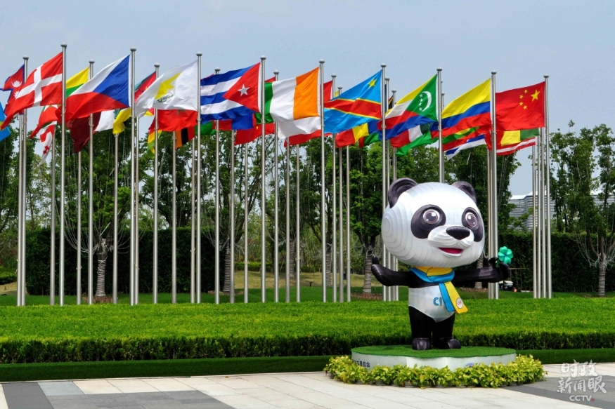△7月27日,第三屆進(jìn)博會(huì)倒計(jì)時(shí)100天,場館外參展國國旗飄揚(yáng)。