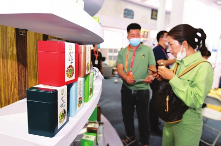 我省展商正向觀展者介紹“槐花苦蕎茶”的功效。