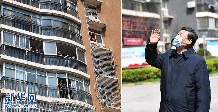 3月10日,習(xí)近平專門赴湖北省武漢市考察新冠肺炎疫情防控工作。這是習(xí)近平在東湖新城社區(qū)考察時(shí),向在家隔離居住的居民揮手致意、表示慰問(拼版照片)。 新華社記者 謝環(huán)馳 攝
