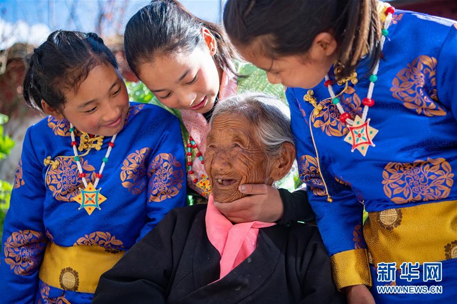 109歲的索朗卓瑪和曾孫女旦增宗吉(右一)、旦增央吉(左一)、丹增曲吉在自家的院子里(3月24日攝)。新華社記者 普布扎西 攝