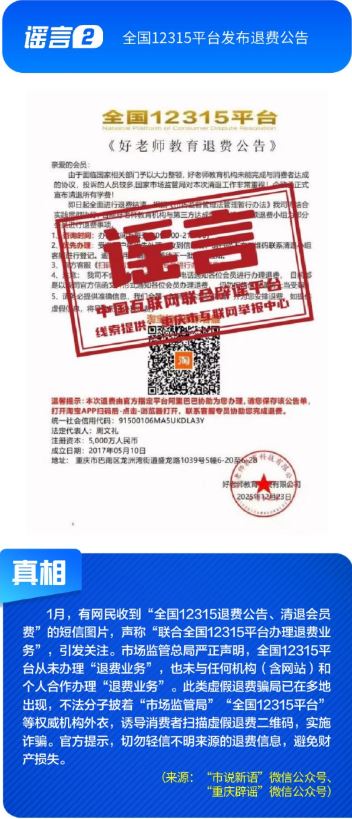 ??公共政策領域謠言誤導公眾決策?!吧绫?]有有效期限制、未到期不能換新卡”是對社??ü芾碚叩恼`讀,給民眾平添困擾;“28家博物館元旦期間閉館”實為少數(shù)博物館根據(jù)運營安排所做的微調,網帖嚴重夸大實際閉館情況,引發(fā)負面炒作;“深圳有望推行12年義務教育,高中免費”是對現(xiàn)行政策的“超前編造”,誤導學生及家長群體;“全國12315平臺發(fā)布退費公告”,則是假冒監(jiān)管機構名義散播不實通知,為后續(xù)詐騙行為做鋪墊。