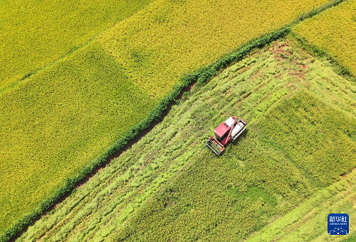 8月24日,在湖南省衡陽市祁東縣歸陽鎮(zhèn),煜東種養(yǎng)合作社的員工駕駛農(nóng)機在收割稻谷(無人機照片)。(新華社發(fā) 曹正平 攝)