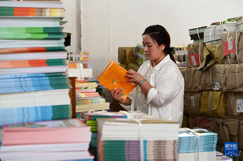 8月25日,工作人員在河北新樂市新華書店倉庫整理清點中小學(xué)教材,準(zhǔn)備送往各學(xué)校。(新華社發(fā) 賈敏杰 攝)