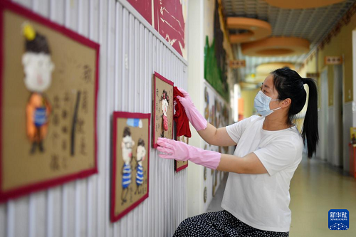 8月25日,山東省青島市嶗山區(qū)金家?guī)X街道中心幼兒園員工在擦拭走廊畫框。(新華社發(fā) 王海濱 攝)