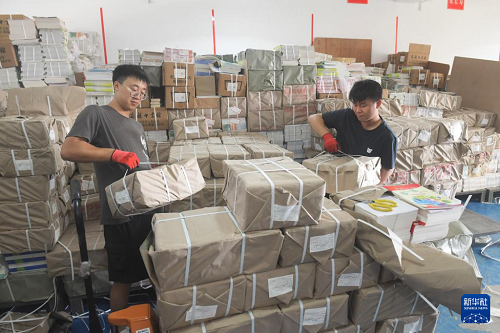 8月25日,在河南省沁陽市新華書店教材倉庫,工作人員在配發(fā)新學(xué)期教材。(新華社發(fā) 楊帆 攝)