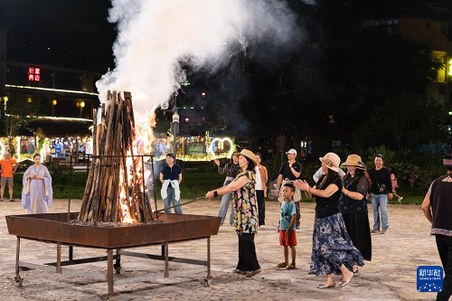 8月24日,游客在云南省廣南縣壩美村參加篝火晚會。(新華社記者 高詠薇 攝)