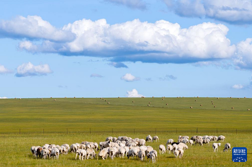 8月26日,在內(nèi)蒙古呼倫貝爾市鄂溫克族自治旗,羊群在草原上吃草(無人機(jī)照片)。(新華社記者 馬金瑞 攝)