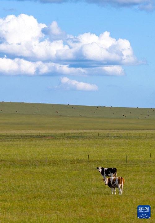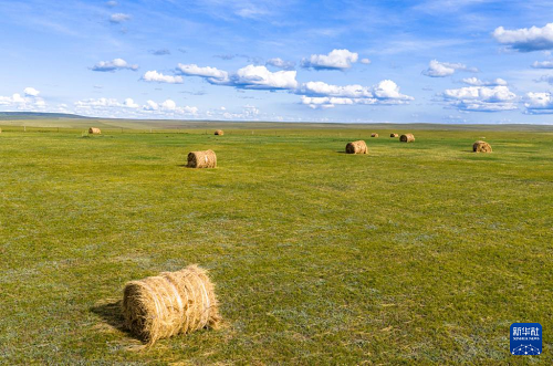 初秋時(shí)節(jié),內(nèi)蒙古呼倫貝爾大草原草色漸黃。在遼闊的草原上,牧民將豐收的牧草捆扎成卷,成群的牛羊、馬匹漫步其間,勾勒出一幅祥和美麗的秋日豐收?qǐng)D景。