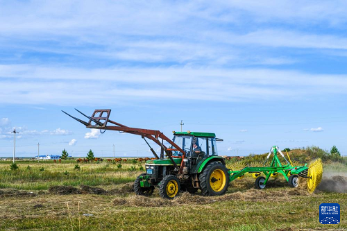 8月26日,在內(nèi)蒙古呼倫貝爾市鄂溫克族自治旗,牧民駕駛割草機(jī)收割牧草。(新華社記者 馬金瑞 攝)