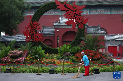 9月3日清晨,市民在北京鼓樓附近清掃街道。(新華社記者 杜昕怡 攝)