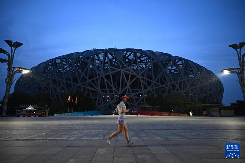 9月3日清晨,市民在鳥(niǎo)巢前晨跑。(新華社記者 陳浩明 攝)