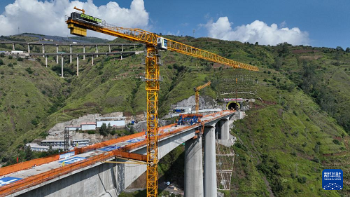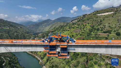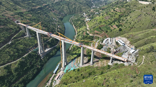 9月7日在云南省昭通市魯?shù)榭h江底鎮(zhèn)拍攝的渝昆高鐵江底牛欄江特大橋合龍現(xiàn)場(chǎng)(無人機(jī)照片)。(新華社發(fā) 張廣玉 攝)