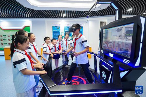 9月8日,江蘇省泰州市姜堰區(qū)淮海小學(xué)學(xué)生在校園科技館體驗(yàn)VR項(xiàng)目。(新華社發(fā) 周社根 攝)