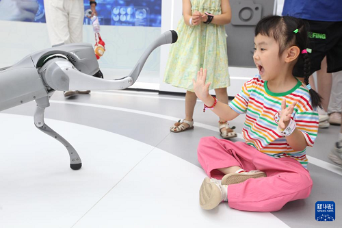9月7日,在位于江蘇省徐州市云龍區(qū)的一家科學(xué)探索館,小朋友與機(jī)器狗互動(dòng)。(新華社發(fā) 蒯創(chuàng) 攝)