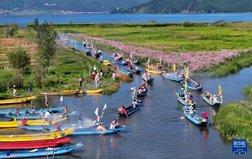 9月16日,當?shù)厝罕婑{著豬槽船從瀘沽湖的洛洼北碼頭開始轉海(無人機照片)。(新華社記者 江宏景 攝)