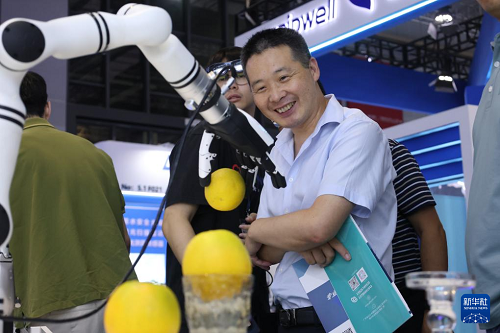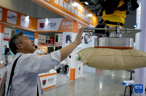 9月23日,參觀者在一個進行抓取動作演示的機器手展品前駐足觀看。(新華社發(fā) 潘宗源 攝)