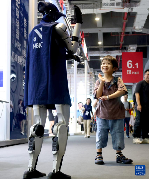 9月23日,小朋友在展會現(xiàn)場與人形機器人互動。(新華社發(fā) 潘宗源 攝)