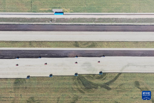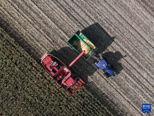 9月23日,在黑龍江北大荒農(nóng)業(yè)股份有限公司友誼分公司一旱田地塊,大型農(nóng)業(yè)機(jī)械在進(jìn)行玉米收獲作業(yè)(無人機(jī)照片)。(新華社記者 王松 攝)