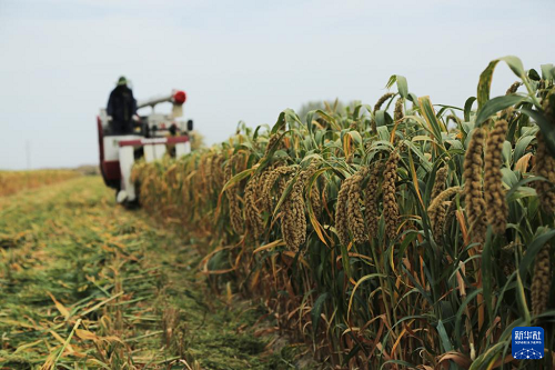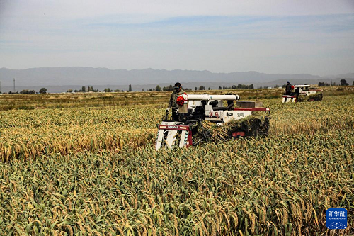 9月24日,收割機(jī)在甘肅省張掖市山丹縣位奇鎮(zhèn)暖泉村收割谷子。(新華社發(fā) 陳禮 攝)