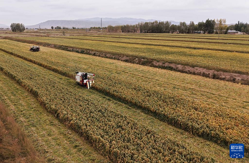 秋分時(shí)節(jié),地處祁連山北麓、河西走廊中段的甘肅省張掖市各種作物陸續(xù)成熟,農(nóng)民開始收獲,田間一派豐收景象。