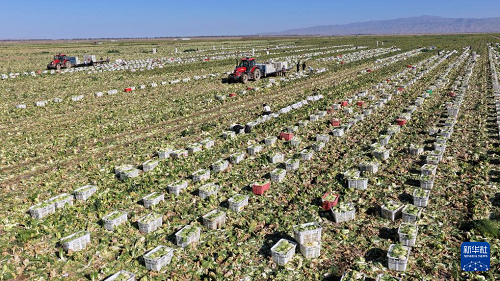 9月23日,菜農(nóng)在甘肅山丹馬場蔬菜基地里收獲蔬菜(無人機(jī)照片)。(新華社發(fā) 王超 攝)