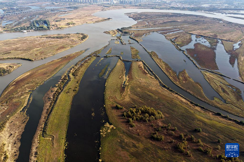 這是10月7日拍攝的哈爾濱金河灣濕地公園景色(無人機(jī)照片)。(新華社記者 王松 攝)