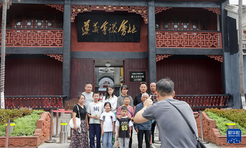 10月8日,游客在貴州省遵義市遵義會議會址合影留念。(新華社發(fā) 袁福洪 攝)