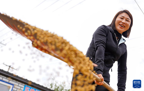 10月9日,韓鳳香在合作社內(nèi)晾曬剛收獲的大豆。(新華社記者 顏麟蘊 攝)