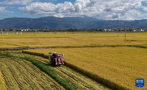 10月10日,工人在云南省大理市喜洲鎮(zhèn)水稻種植基地收割水稻(無(wú)人機(jī)照片)。(新華社發(fā) 梁志強(qiáng) 攝)
