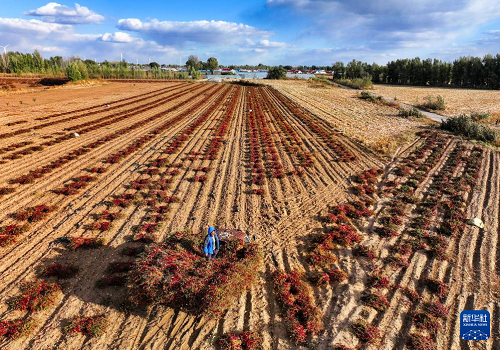 10月19日,在通遼市開魯縣東風(fēng)鎮(zhèn)六合堂村,村民在田地里收獲干椒(無(wú)人機(jī)照片)。(新華社記者 連振 攝)