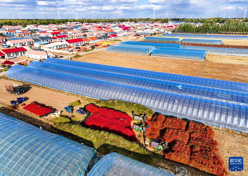 10月19日,在通遼市開魯縣東風(fēng)鎮(zhèn)六合堂村,村民在分揀紅干椒(無(wú)人機(jī)照片)。(新華社記者 連振 攝)