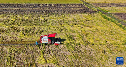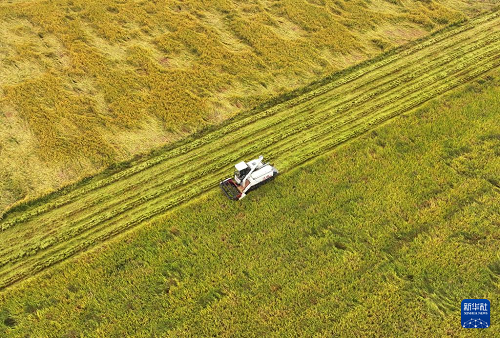 10月22日,湖南省衡陽市衡山縣白果鎮(zhèn)村民駕駛農(nóng)機收割晚稻(無人機照片)。(新華社發(fā) 曹正平 攝)