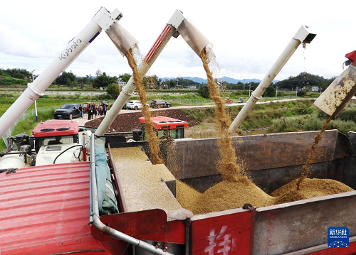 10月22日,在四川省達州市大竹縣石橋鋪鎮(zhèn)長青村的稻田間,農(nóng)機手將收獲的水稻裝入運糧車。(新華社發(fā) 鄧良奎 攝)