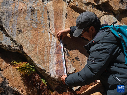 10月21日,陳雪松測量海子山老林溝拉托扎巖畫信息。(新華社記者 薛晨 攝)