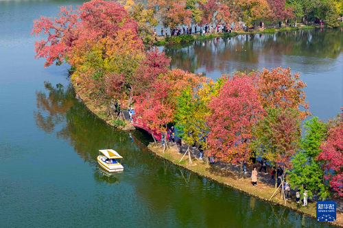 11月2日,游客在江蘇南京中山植物園月牙堤上賞秋游玩(無人機照片)。(新華社發(fā) 史俊 攝) 深秋時節(jié),草木色彩斑斕,與秋水相映成景,在晴空白云下鋪展出一幅美麗畫卷。 (責(zé)任編輯:蔡文斌) |