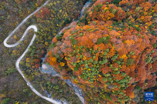 漢中市南鄭區(qū)境內(nèi)的黎坪國家森林公園秋色(11月5日攝,無人機照片)。(新華社記者 邵瑞 攝)