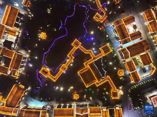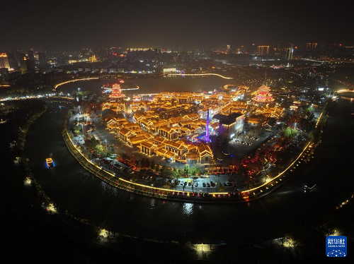 京杭大運河滄州段沿線建筑燈光璀璨(11月11日攝,無人機照片)。(新華社記者 牟宇 攝)