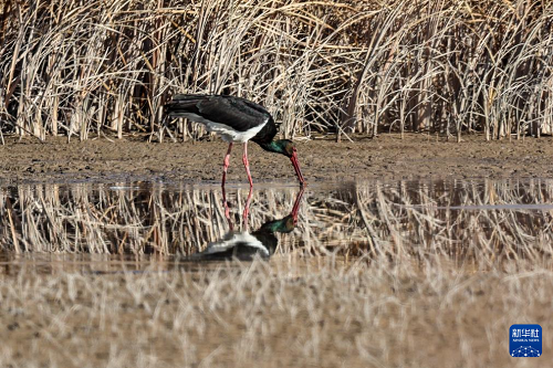 11月12日,黑鸛在張掖黑河濕地國家級自然保護(hù)區(qū)高臺段一處濕地淺灘覓食。(新華社記者 郎兵兵 攝)