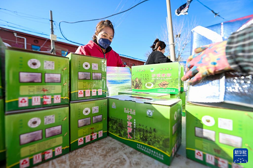 11月20日,在天津市西青區(qū)辛口鎮(zhèn),農(nóng)民在打包準備發(fā)運的沙窩蘿卜。(新華社記者 趙子碩 攝)