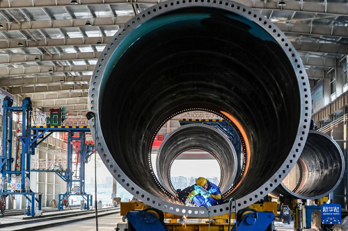 11月20日,在甘肅省酒泉經(jīng)濟技術(shù)開發(fā)區(qū)的中國水電四局(酒泉)新能源裝備有限公司塔筒制造車間,工作人員進行風機塔筒焊接作業(yè)。(新華社記者 郎兵兵 攝)