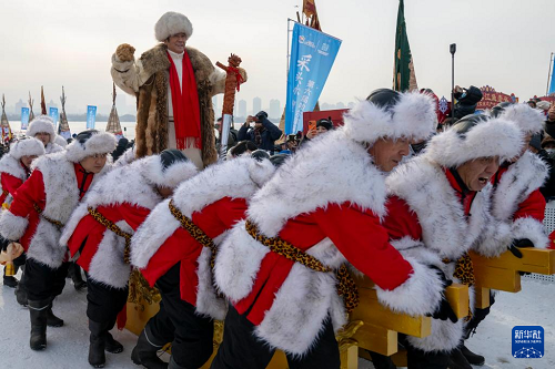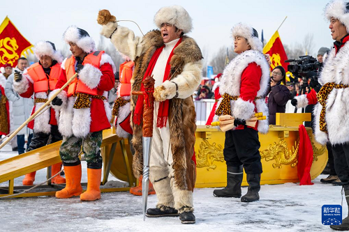 12月7日,在第六屆哈爾濱采冰節(jié)現(xiàn)場,“冰把頭”帶領(lǐng)“采冰漢子”去采頭冰。(新華社記者 張濤 攝)