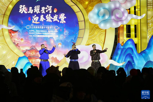 12月20日,當?shù)貫跆m牧騎演員在燈會上表演。新華社發(fā)